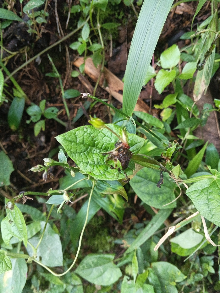 The image displays a variety of green plants. A broad, light-green leaf is centrally located with a dark, decaying mass upon it. Slender vines with small, rounded leaves extend around the central leaf. A blade of grass stands tall on the right side. The background is filled with assorted green foliage and dark soil.
