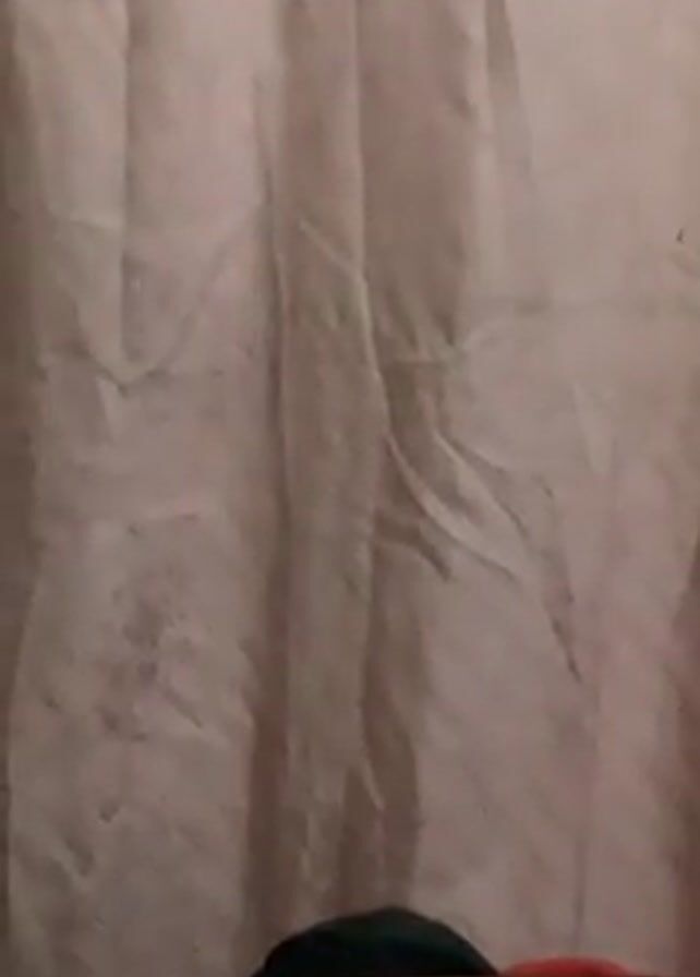 A young child wearing a red Minecraft shirt, a black baseball cap, and silver sunglasses jumps in front of a light-colored curtain. The child appears to be smiling and moving with energy. A wooden table with a pen and other small items is visible at the bottom of the frame. The lighting is somewhat dim, and the background is a textured fabric.