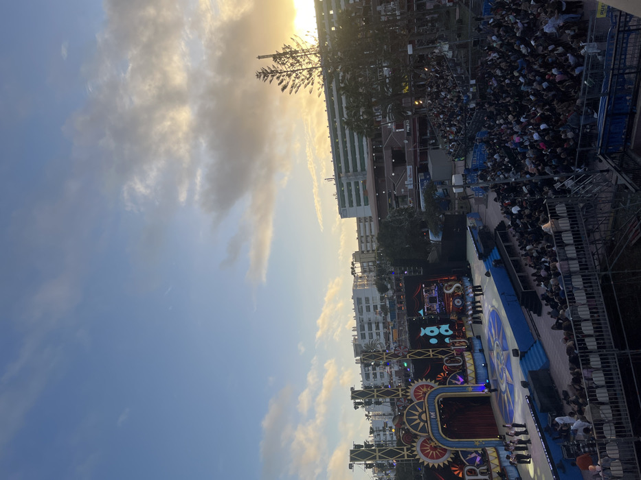 An outdoor event is depicted in San Bartolomé de Tirajana, Spain, during the late afternoon or early evening, characterized by a partly cloudy sky and a low sun positioned towards the right horizon. The scene centers on a large, elaborate stage with a circus theme, featuring an arched entrance, large video screens displaying the word "CIRCUS," and decorative elements including lighting fixtures and gear-like designs. On the stage, a group of approximately 6-8 individuals, dressed in what appears to be uniform attire (white shirts and dark trousers), stands centrally. A smaller group of 3-4 individuals is positioned on the stage's left side. Blue-colored steps provide access to the stage, which is also flanked by various production equipment. In the lower-left foreground, a professional video camera on a tripod is visible, indicating the event is being recorded. Facing the stage, a large audience occupies tiered grandstands constructed from metal scaffolding and white seating. The crowd, comprising hundreds of individuals, is largely seated, observing the stage. Beyond the event area, multi-story buildings, consistent with urban or resort architecture, line the background. Interspersed among these structures and around the venue are numerous palm trees and other tall trees, one of which is silhouetted prominently against the sunset on the far right. Commercial establishments, including one partially visible signage "Pop T... C...", are present behind the audience seating. The overall environment is set for a public performance or ceremony.