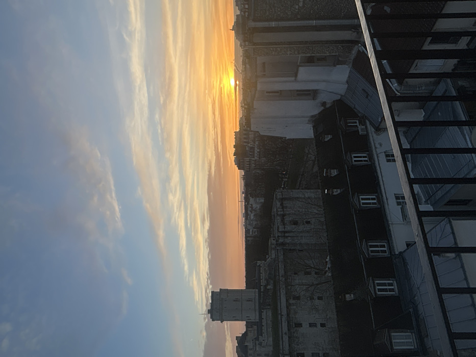 A vibrant sunset dominates the horizon, casting a warm, golden glow across the sky and cityscape. Wispy clouds stretch horizontally, mirroring the colorful gradation of the sky. Below, rooftops of buildings are visible, interspersed with windows. A dark, metal railing occupies the right side of the frame. The scene exudes a serene and urban atmosphere.
