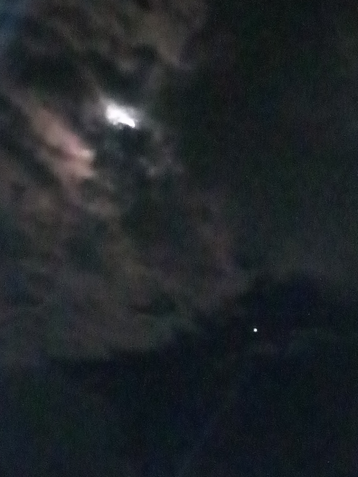 A cloudy night sky is depicted, with a bright moon partially obscured by thick, dark clouds at the upper left. A solitary, bright star or planet shines prominently in the lower right quadrant of the image, contrasting against the darkness. The overall mood is atmospheric, highlighting the interplay of light and shadow in the night sky.