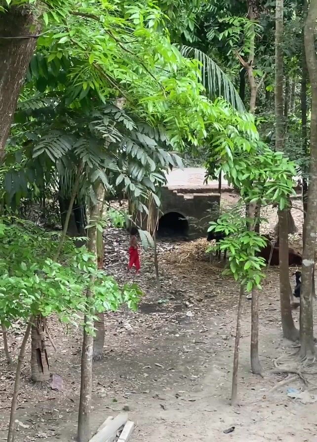 A person in a red outfit walks down a dirt path in a wooded area. A concrete structure with a hole in it is visible at the end of the path. Lush green foliage surrounds the path and structure. A red cloth hangs from a tree branch on the left side of the path.