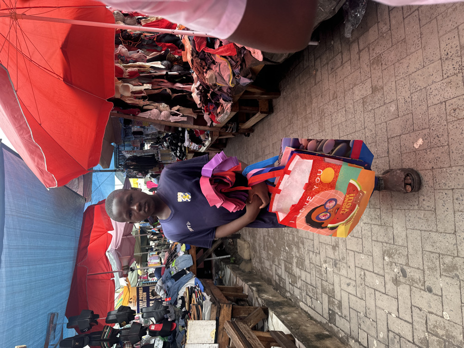 The image depicts an outdoor market scene in Dar es-Salaam, Tanzania. A young male, appearing to be a boy or teenager, stands centrally in a paved aisle, facing the camera. He wears a dark blue t-shirt with a white "Craft" logo and a yellow/black crest on the chest, along with dark, open-toed sandals. He holds several folded colorful fabric items (pink, purple, blue) in his left arm, and in his right hand, he carries multiple reusable shopping bags. The prominent bag features a colorful graphic with a stylized person, "I LOVE YOU," and "THANK YOU!" text, alongside a watermelon slice. The market aisle is paved with light grey interlocking bricks. Overhead, a canopy of blue and red tarpaulins and umbrellas provides shade. On the left, a wooden stall displays black bags hanging above and piles of clothing on a table. A sign with partially visible text "MOBILE PHONES SOLUTION" is present in the background. On the right, another wooden stall features a large red market umbrella, with numerous bras and other clothing items hanging from racks and piled on the table. A partial figure wearing a light-colored top is visible on the far right edge of the frame, facing away from the camera. Blurred figures and market activity are visible further down the aisle in the background.