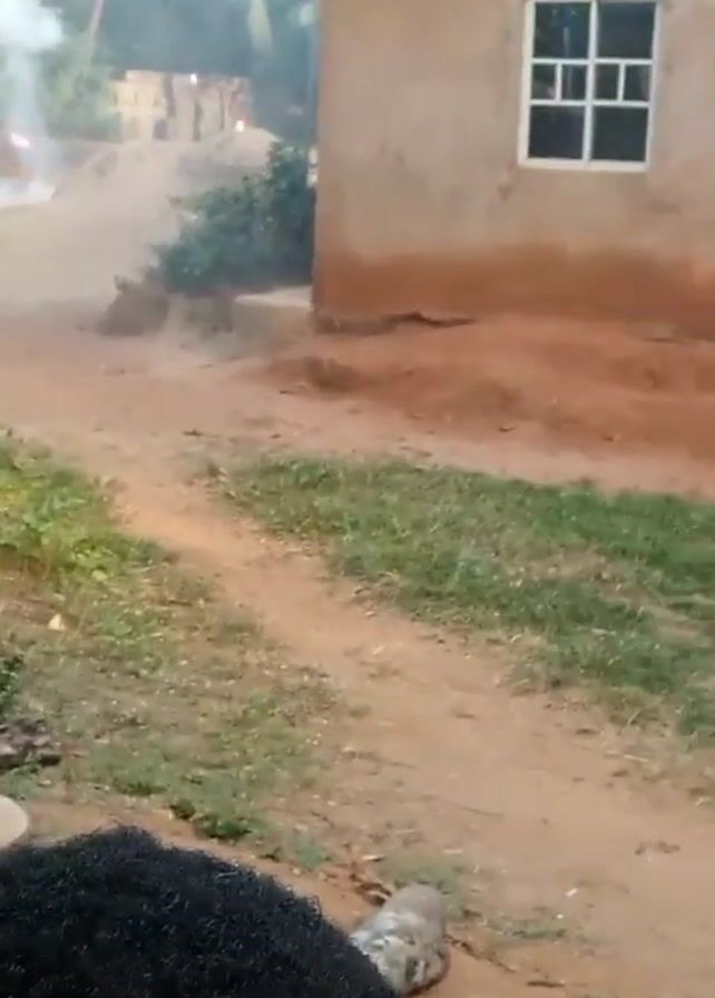 person filming from ground level. The camera pans up and to the right, revealing a sandy landscape with a small building in the background. Smoke is visible rising from an area behind a pile of sand or dirt. The camera continues to move, showing a stack of cinder blocks on the left side of the frame and a small log on the ground. The building has a white-framed window. Trees, including what appear to be palm trees, are visible in the background. A loud bang or explosion is heard. The video is filmed with a mobile device, as indicated by the "Infinix HOT PLAY" watermark at the bottom.
