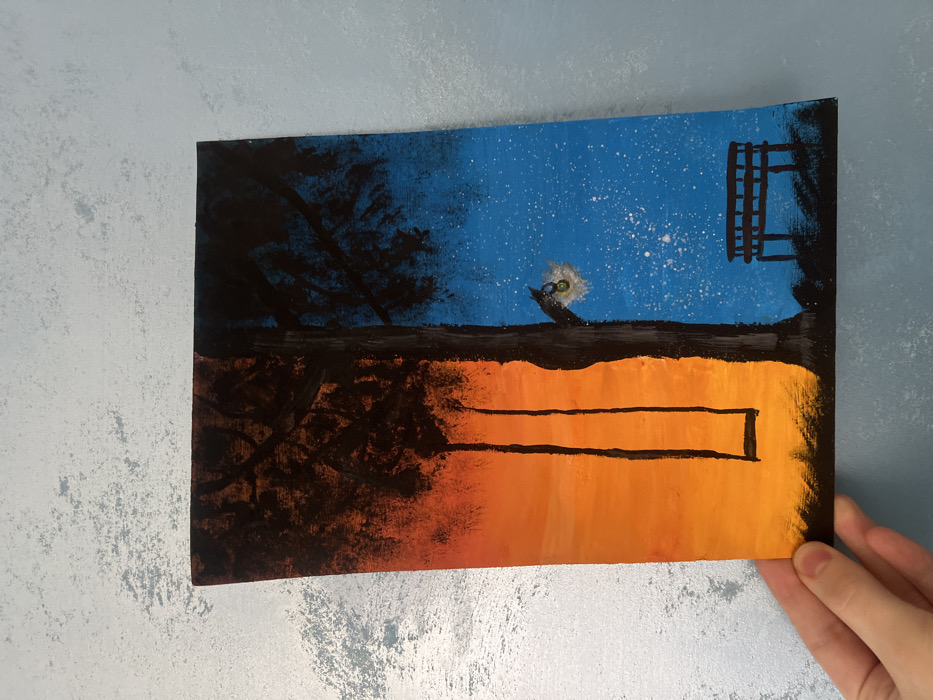 A light-skinned left hand holds a vertical rectangular painting against a textured light blue wall. The painting depicts a bifurcated landscape. The left half of the painting features an orange to yellow sky with a dark, silhouetted swing suspended from an unseen branch. The right half displays a dark blue sky with numerous white specks representing stars, a dark lantern with a yellow-green glow hanging from a tree branch, and a dark, slatted park bench. A single large, dark tree with visible branches stands centrally, dividing the orange and blue skies. A dark, undulating ground line extends across the bottom of both halves. The specific location in the city of Karnobat, Bulgaria, is not discernible from the image.
