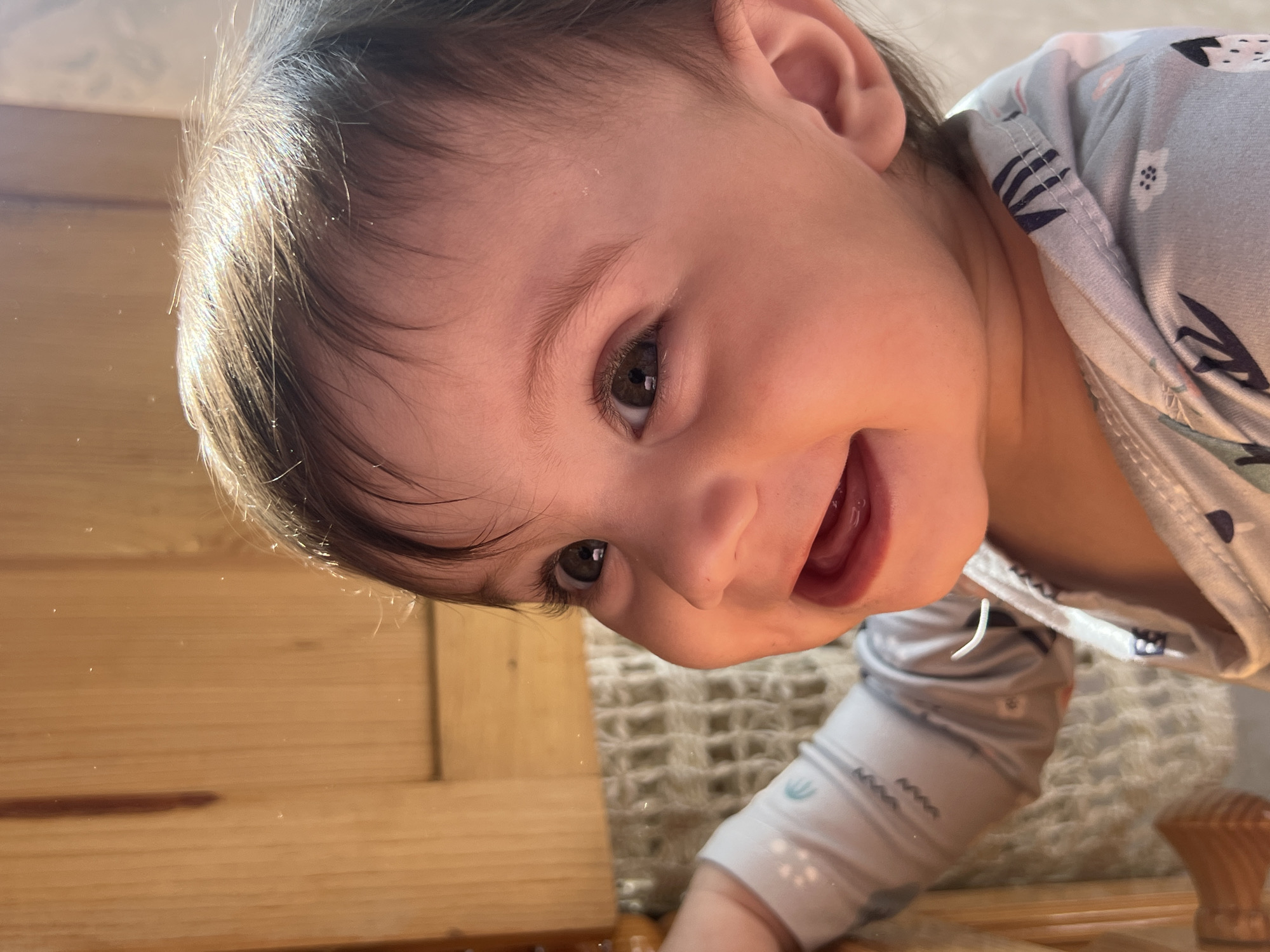 The scene, located indoors in Elena, Bulgaria, presents a close-up, eye-level portrait of an infant. The subject, positioned centrally, exhibits a wide, open-mouthed smile, revealing gums and the absence of upper teeth. The infant possesses dark brown hair, prominent eyelashes, and brown irises, with a gaze directed upwards and to the right. The left arm and hand are partially visible in the lower-left quadrant, dressed in a light grey garment adorned with small, repetitive patterns including white and blue abstract shapes; the hand appears to be grasping a light brown wooden structure. This wooden surface extends vertically along the left and horizontally across the top, indicating a wooden fixture. A cream-colored, woven textile material with a grid-like pattern is visible in the mid-ground, beneath the wooden structure and behind the infant's arm. Illumination from an unseen light source, likely natural, strikes the upper right side of the infant's head and face, creating bright reflections in the eyes and on the fine hairs. Numerous small, bright particulate specks are discernible in the air, particularly against the illuminated wooden background.