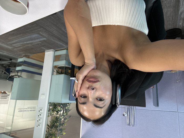 The image depicts a woman seated at a desk in a modern office environment in Hod HaSharon, Israel