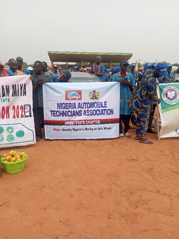 group of men standing in a line, holding a large banner that reads "NIGERIA AUTOMOBILE TECHNICIANS ASSOCIATION, KEBBI STATE CHAPTER, Motto: Keeping Nigerians Moving on Safe Wheels"