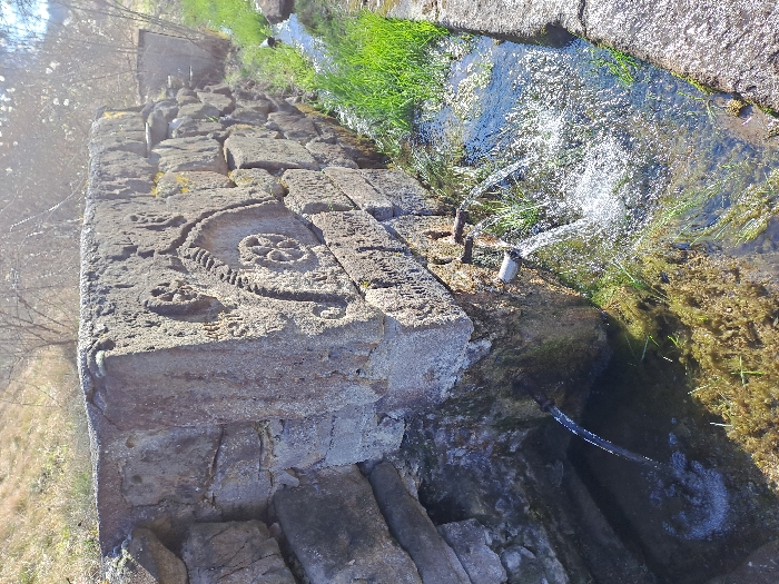 An outdoor scene in Unknown, Unknown depicts a weathered stone wall, likely part of an ancient spring or fountain structure. The wall features deeply carved relief ornamentation, including stylized circular motifs resembling wheels and a larger, elongated, possibly animal or chariot-related element. Partially legible inscriptions are also present among the carvings. Three metal spouts protrude from the lower section of the wall. The leftmost spout directs water into a shaded, recessed basin integrated into the wall's base. The two rightmost spouts discharge streams of water into a narrow, stone-lined canal running parallel to the wall. This canal contains clear flowing water, abundant bright green aquatic vegetation, and some darker algal growth. The ground immediately surrounding the canal and wall is covered in green grass. The background shows sparse, dry vegetation and bare deciduous trees under bright sunlight, indicating a natural or rural environment. No people are visible.