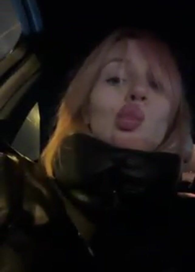 woman in a car wearing a black coat and a seatbelt. She has blonde hair with pink undertones and is making a duck face at the camera. The interior of the car is dark, and a street light is visible outside the window. The woman's face fills the frame as she zooms in, showing her blue eyes and the pink lipstick she is wearing.