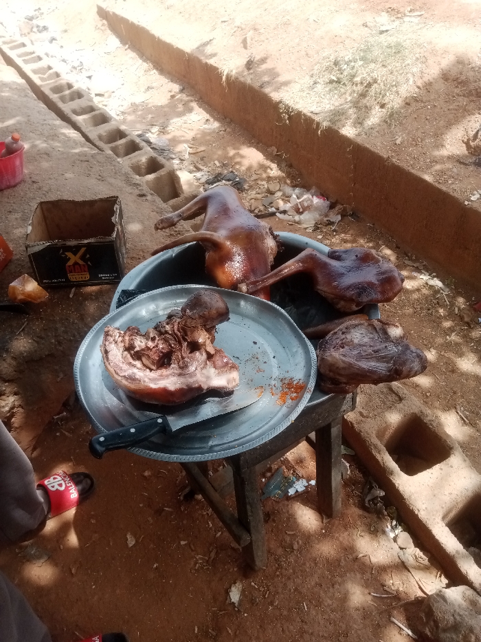 - "The scene in Pankshin, Nigeria, depicts an outdoor vendor's display of roasted meat on reddish-brown dirt ground, illuminated by strong sunlight and dappled shadows" by FM-9JAB42, licensed under CC BY 4.0