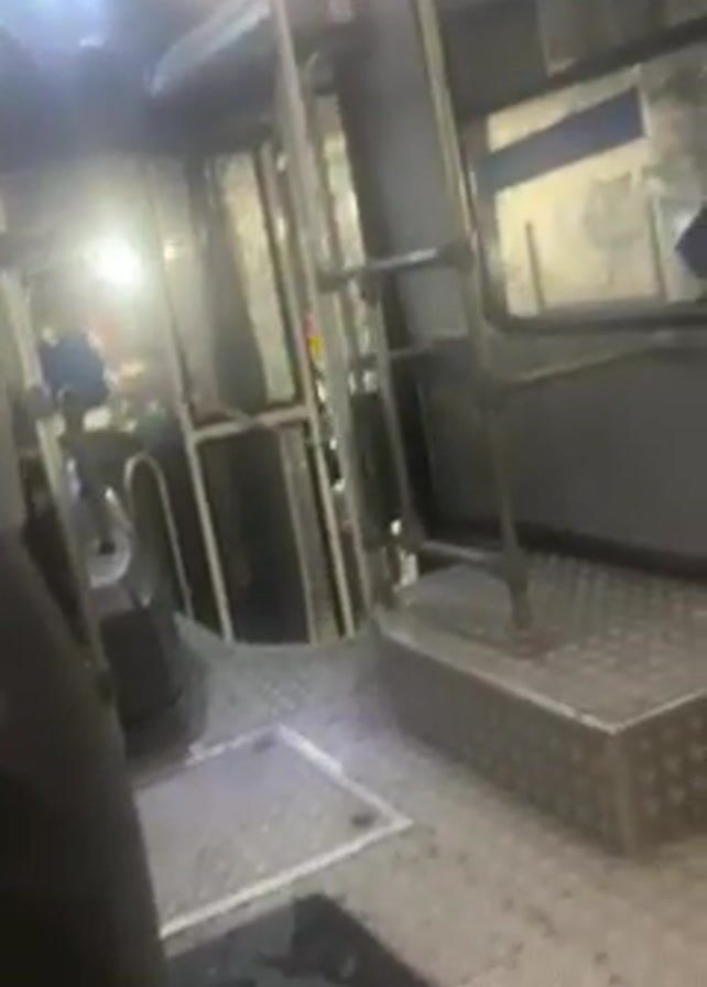 - ". The video shows the interior of a bus, focusing on the area near the front entrance. The floor is covered in a metal diamond plate pattern. There are metal handrails and a small metal step-up near the door. The outside is visible through the rain-streaked window. There are people and light sources visible outside the bus. The camera appears to be held by someone seated in one of the front seats." by FM-jvCZo2, licensed under CC BY 4.0