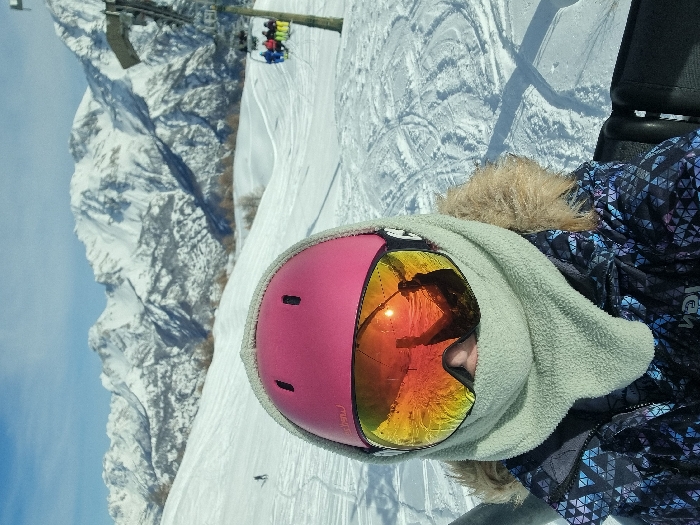 The image displays an individual on a snowy mountain slope in Cesana Torinese, Italy, positioned as if on a ski lift