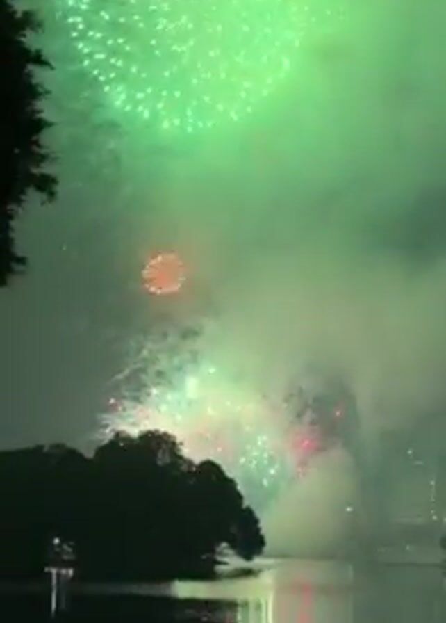 A fireworks display occurs over a body of water at night. Fireworks of various colors explode in the sky, including green, red, purple, and blue. The explosions are reflected in the water. A dark silhouette of trees is visible in the foreground, along with what appears to be a building in the background. Smoke fills the air around the fireworks.