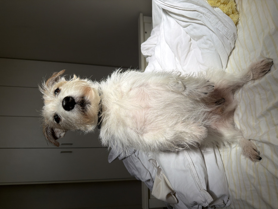 - "A light-colored, scruffy-haired terrier-type dog with predominantly white fur and light brown markings on its ears and muzzle is depicted in an indoor setting" by FM-k41Xm2, licensed under CC BY 4.0