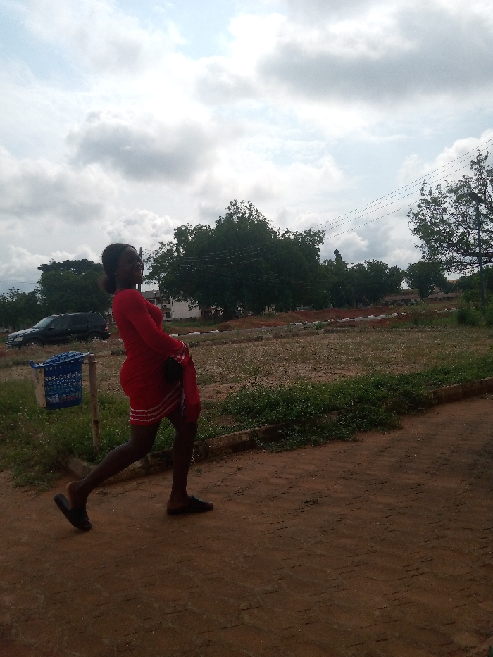 The image depicts an outdoor scene in Nsugbe, Nigeria, under an overcast sky. In the left foreground, a dark-skinned adult female is captured in a dynamic pose, appearing to be mid-stride or striking a pose. She wears a long-sleeved red dress featuring white horizontal stripes on the lower portion of the skirt and dark flat shoes or slippers. Her hair is styled in a dark bun, and she is smiling while looking towards the camera. Her right arm is bent, holding a small dark object or fabric. The immediate ground beneath her is a reddish-brown paved surface, possibly interlocking bricks. To her left, a blue plastic-mesh waste bin is mounted on a pole. Behind the bin, a dark-colored SUV is partially visible, parked near what appears to be building structures partially obscured by trees. The midground features an expansive unpaved field with sparse green vegetation and exposed reddish-brown soil, traversed by rows of small concrete markers. The background is dominated by a dense line of green trees. Overhead power lines are visible across the sky, suspended by utility poles, and a light pole with a solar panel is present on the far right. The sky shows a mix of grey and white clouds.