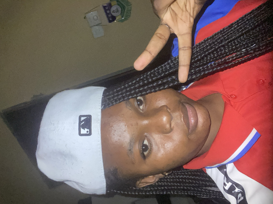 A young person with dark skin wears a light-colored baseball cap and a red shirt with a blue and white striped collar. They have dark, braided hair. Their hand is raised in the "peace" sign, with a ring visible on one finger. The individual is facing the camera with a slight smile. Behind them is a wall with various items attached. The photo appears to be taken indoors in low lighting.