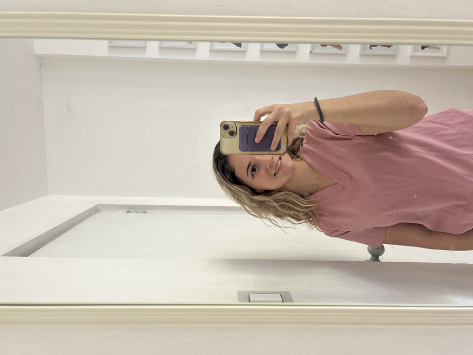 A woman with wavy blonde hair smiles as she takes a mirror selfie. She holds a gold-colored phone with a purple card holder. She wears a light pink scrub top and a black hair tie on her wrist. The background is a white wall with a series of framed pictures near the ceiling. The mirror frame is white and ornate. A white sink is partially visible in the bottom left corner of the mirror.