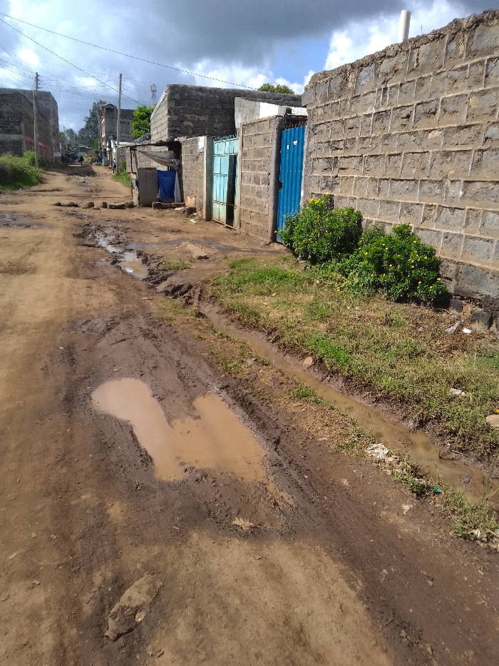 The image displays an unpaved, muddy dirt road in Njoro ward, Kenya, under an overcast sky. The road surface is uneven, characterized by several brown mud puddles and distinct tire tracks. Along the right side, a strip of green grass and sparse weeds borders a single-story structure constructed from unpainted grey concrete blocks. This building features a bright blue corrugated metal door, partially open, positioned next to a lighter blue metal gate. Two green bushes with small yellow flowers grow in front of the building. A narrow, water-filled drainage channel runs adjacent to the grassy strip. On the left side, a series of similar concrete block buildings extends into the distance, with smaller, temporary structures, including one covered by a blue tarp, visible between them. Utility poles with overhead lines are present further down the road. A white vertical pipe is visible on the roofline of the building on the immediate right. A communication tower is faintly discernible in the far background. No individuals, specific actions, or interactions are observable within the frame.