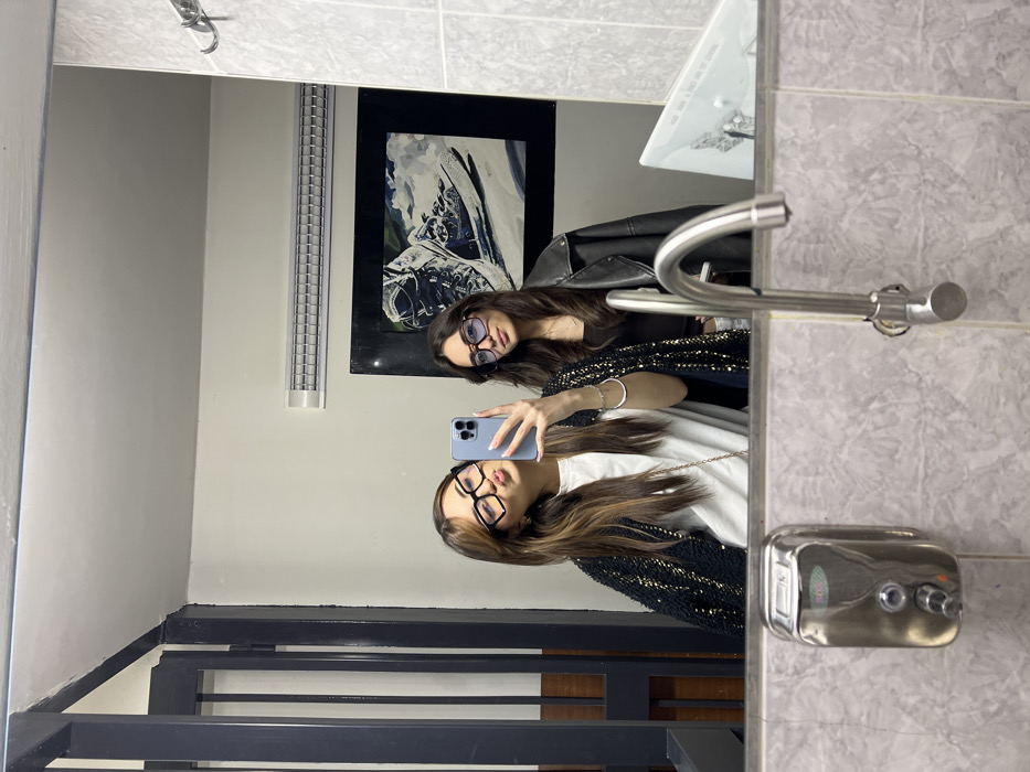 The image depicts two young women taking a mirror selfie in a restroom located in Yerevan, Armenia. **Subjects:** 1. **Woman on the left (in reflection):** Has long, straight brown hair with lighter highlights and wears large, black-framed glasses. She holds a light blue iPhone in her left hand to capture the selfie, with her lips puckered in a "duck face" expression. She wears a white t-shirt and a dark, textured cardigan or jacket adorned with gold embellishments. A thin chain strap is visible across her chest, and a silver-colored bracelet is on her left wrist. 2. **Woman on the right (in reflection):** Has long, straight dark brown hair and wears large, dark-framed glasses with a blue tint. She has a subtle smile and wears a black top with a black leather jacket draped over her shoulders. A delicate necklace is visible. **Environment and Objects:** The setting appears to be a public or commercial restroom. The lower portion of the visible wall is covered with light gray, rectangular tiles featuring a subtle veined pattern. The upper wall is painted a light, neutral color. Mounted on the tiled wall, a chrome-plated manual liquid soap dispenser with two buttons is visible to the left, and a tall, chrome gooseneck faucet extends upwards from the center. In the background, on the upper wall, a framed artwork depicting a stylized, high-top sneaker is displayed. Above the artwork, a silver-colored linear air vent is mounted. To the far left, a dark metal structure with vertical bars suggests a doorframe or partition. To the far right, two chrome hooks are attached to a tiled wall section. The scene is well-lit by internal artificial light.