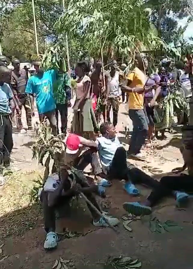 large group of people outdoors, with a focus on four individuals sitting or lying on the ground in the foreground. These individuals are surrounded by foliage and some are being poked with leafy branches by others in the crowd. Most of the people in the crowd are standing. Some are holding leafy branches, while others are simply observing. The group seems to be in a wooded area with trees visible in the background. A man in a white patterned shirt is positioned closest to the camera and gestures with his arm. The overall atmosphere appears chaotic and potentially ceremonial or ritualistic.