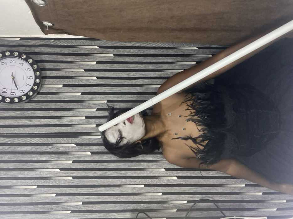 A woman with white face paint and dark hair lies on a striped surface. A white pole rests across her forehead. She wears a black, feathered garment. A clock with rhinestone details is positioned to her left. A brown curtain hangs overhead. A gold-colored necklace adorns her neck. A power cable is visible in the bottom right corner.