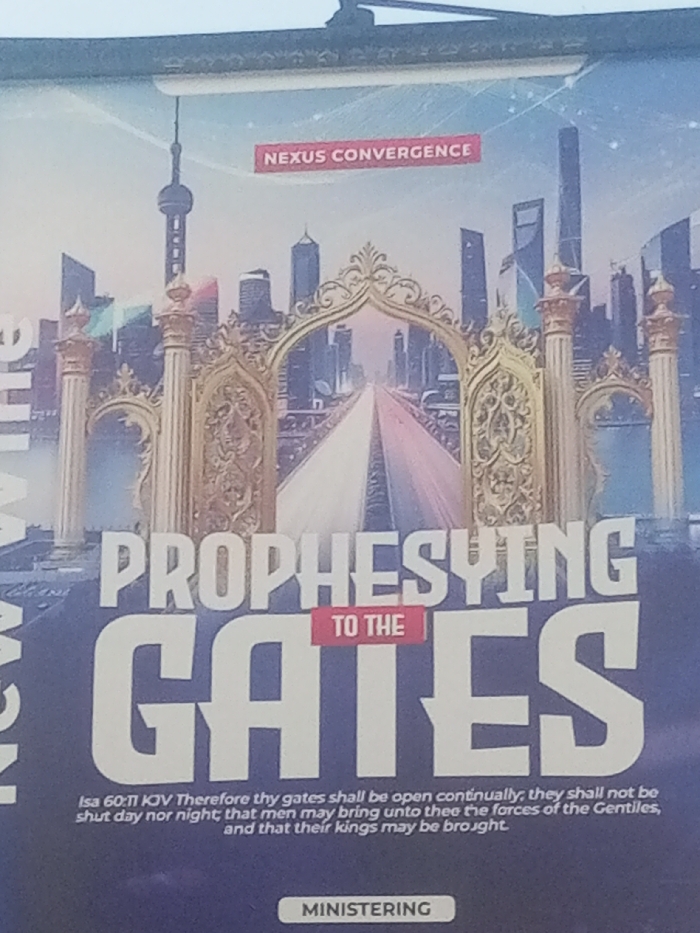 A poster with a religious theme displays the words "NEXUS CONVERGENCE," "PROPHESYING TO THE GATES," and "MINISTERING