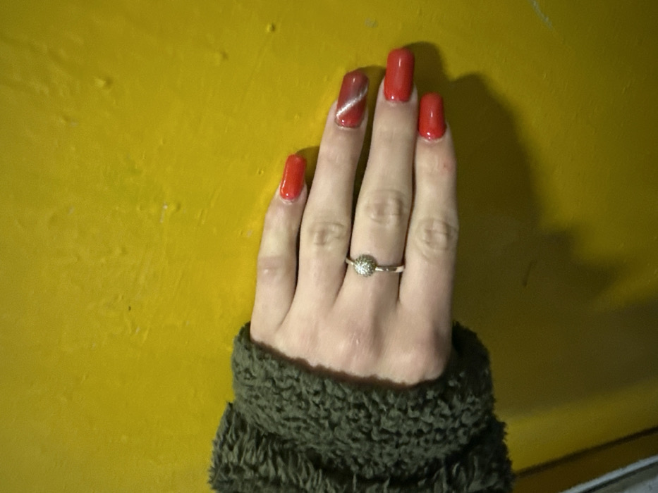 A human right hand is prominently displayed against a textured, uniformly yellow wall in Lanchkhuti, Georgia. The hand is oriented horizontally, with fingers extended towards the right. A dark green, plush or fleece-like sleeve partially covers the wrist and forearm area. A silver-toned ring, featuring a circular, domed top encrusted with small, reflective elements, is worn on the middle finger. The fingernails are medium-length and have a square-oval shape. The index finger's nail is painted red with a distinct diagonal white or light-colored stripe running across it. The nails of the middle, ring, and pinky fingers are painted a glossy solid red. The yellow wall exhibits slight textural irregularities and minor imperfections consistent with a painted concrete or plaster surface.