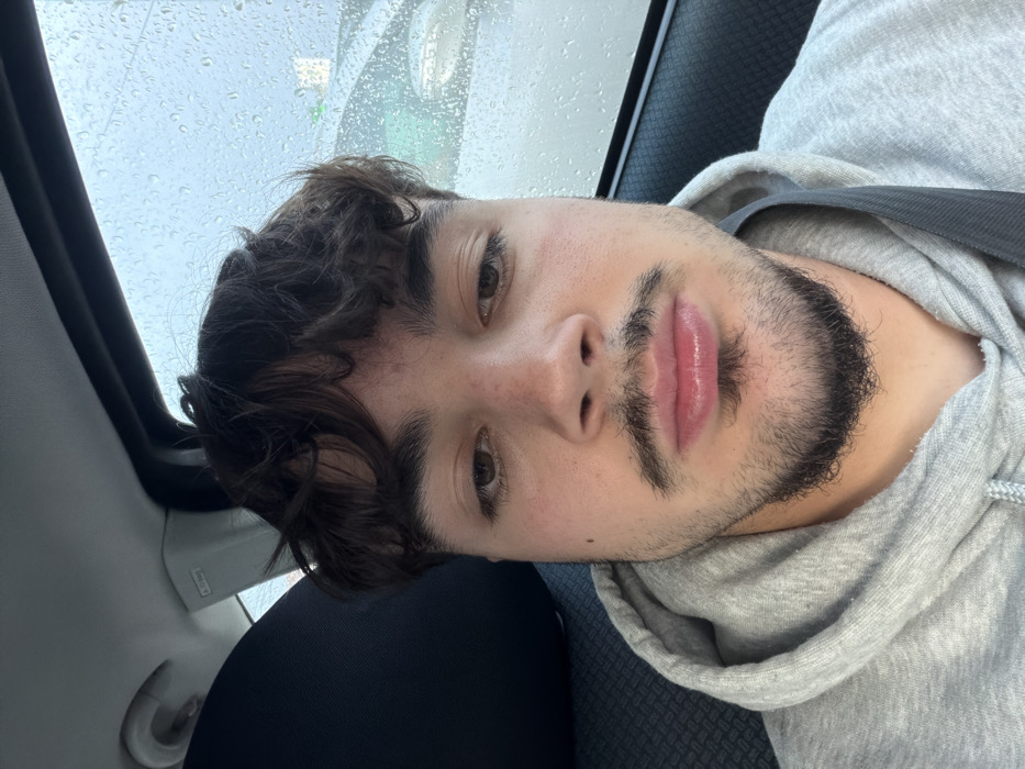 A young man takes a selfie in a car on a rainy day. He has dark curly hair and a short beard. He wears a gray hooded sweatshirt. The car's roof and window are visible, with raindrops blurring the view outside. A seatbelt is visible across his chest. The man is angled slightly to the left, looking directly at the camera. The overall mood is casual and introspective.