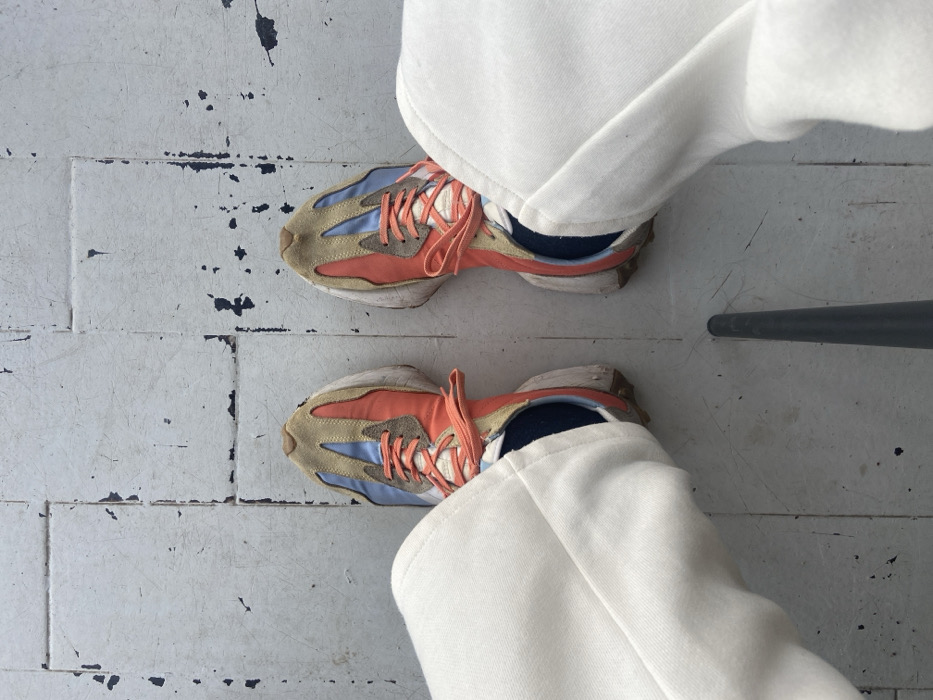 An overhead view captures the lower extremities of an individual positioned on a worn, light grey tiled floor in Petrovac centar, Montenegro. The individual wears off-white or cream-colored relaxed-fit pants, the fabric creased around the ankles. A pair of multi-colored athletic shoes are visible, featuring sections of tan, coral, and light blue on the uppers, with coral laces. Dark blue accents are visible near the inner ankle area, and the white soles show minor scuffing and dirt. The floor consists of rectangular sections, displaying significant wear with numerous dark, irregular patches where the light grey coating has chipped away, revealing a darker underlying material. A single dark, slender, cylindrical object, likely a furniture leg, is positioned vertically between the feet, extending from the bottom center of the frame.