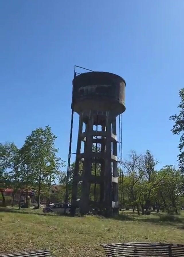 concrete water tower in a park under a clear blue sky. The water tower has a cylindrical tank on top, supported by a framework of concrete columns and beams. A metal ladder runs up the side. The park is grassy, with trees scattered around. In the foreground, there are two metal benches. A building and a car are visible in the background. The camera is static.