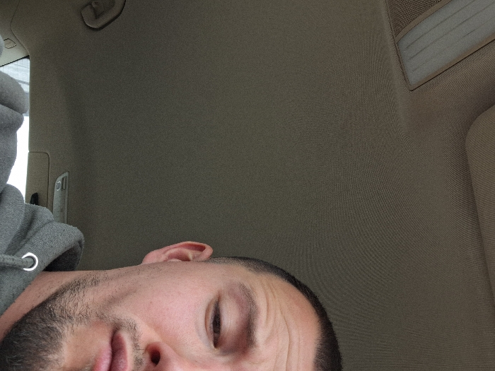 The image displays a close-up, angled view predominantly featuring the interior of a vehicle and the right side of an adult male's face