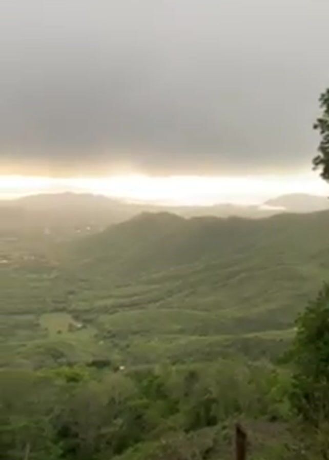 view of a mountainous landscape under a cloudy sky. The hills are covered in dense green vegetation, and a small settlement is visible in the distance. The sun is low on the horizon, creating a warm glow through the clouds. A few trees are in the foreground, adding depth to the scene. Sounds of a male voice are audible in the video.