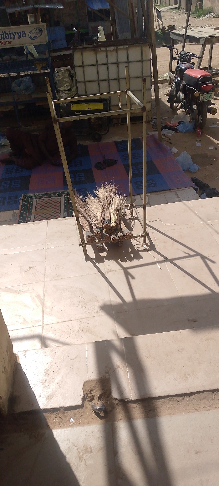 The image depicts an outdoor commercial scene in Danbare, Nigeria, viewed from a slightly elevated perspective. In the immediate foreground, light-colored square tiles cover the ground, exhibiting dirt accumulation and some missing grout lines with an exposed U-shaped metal fixture. A metal display stand in the mid-ground holds multiple bundles of natural fiber brooms, secured with dark material. Strong sunlight casts distinct shadows of the stand and brooms onto the tiled surface. Beyond the tiled area, the ground transitions to a blue and red checkered mat, partially covering a green and red patterned rug. A dark object, possibly an item of clothing, rests on the mat. A person dressed in dark red clothing sits or crouches on a mat to the left. Further back, a large white Intermediate Bulk Container (IBC) tank within a metal frame is visible, positioned near a sign reading "bibiyya Water." Below the IBC, a yellow and black portable generator is present. To the right, an unpaved, sandy area features a parked black motorcycle with a red seat and a rear top box, displaying license plate AKR 531 JJ. Scattered debris, including plastic bags, litters the ground near the motorcycle. In the background, partially obscured by structures, another individual wearing a light-colored head covering stands near the IBC tank. Structures with corrugated metal roofs are visible in the far background under bright daylight conditions.