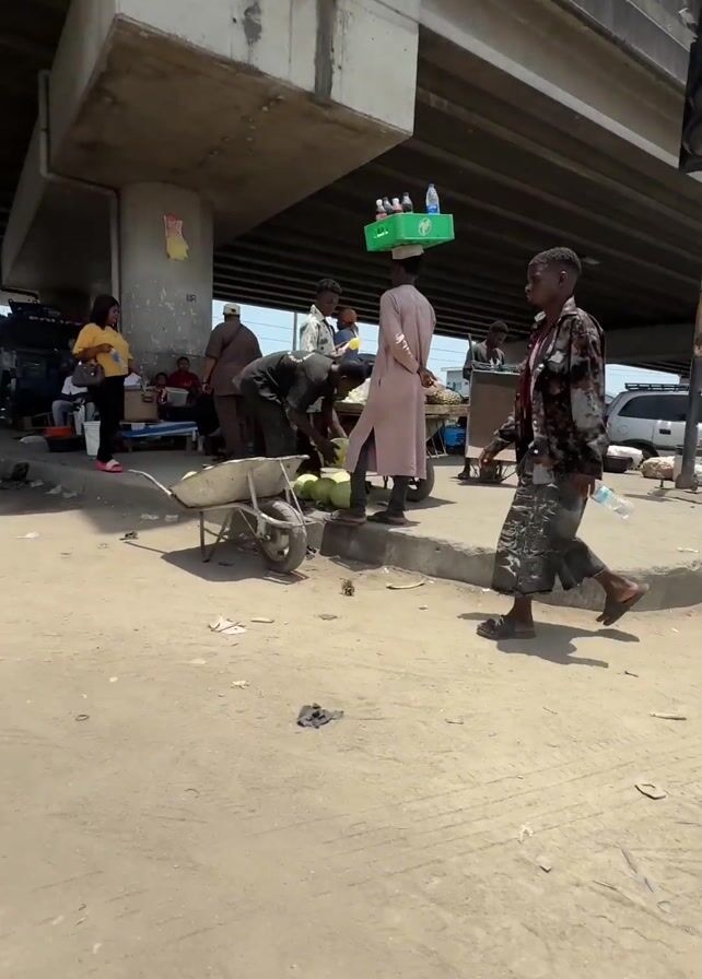 n outdoor scene under a concrete overpass on a bright day. The ground is dirt and concrete. A police officer walks in the foreground, holding a phone, wearing a uniform with a yellow belt, khaki pants, and black boots. People are scattered under the overpass: some are sitting, others are walking, some are behind food carts. A person walks by carrying a case of drinks on their head. There are several cars and motorcycles parked nearby. A person is pushing a wheelbarrow with what appears to be melons. Debris is scattered on the ground. Traffic lights are visible near the overpass. The sky is blue.