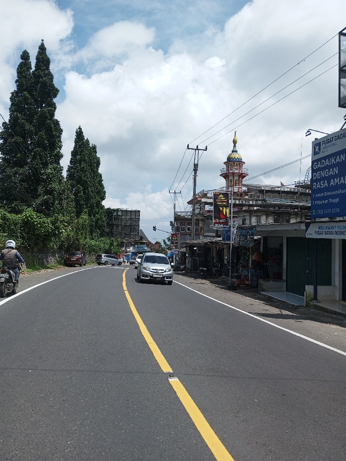The image depicts an urban street scene in Boommlog, Bhutan, under a partly cloudy sky. A paved asphalt road, marked with a solid yellow center line and white shoulder lines, curves gently to the left from the foreground into the midground. Reflective road markers are present along the yellow line. On the left side of the road, a person wearing a light-colored jacket and a white helmet rides a black motorcycle away from the camera. Behind the motorcycle, a steep, heavily vegetated embankment is covered with dense green foliage, topped by several tall, slender coniferous trees. Further down this side, several vehicles, including a dark red sedan and a silver hatchback, are parked near the embankment. A large, rectangular billboard structure is partially visible above the vegetation in the distance. On the right side of the road, a silver compact multi-purpose vehicle (MPV) drives towards the camera, positioned near the yellow center line. A row of commercial buildings lines this side of the street. One prominent building features a multi-tiered, colorful minaret with a golden spire on its rooftop, indicating it may be a mosque or a building with similar architectural style. Multiple commercial banners and signs are affixed to the buildings, including a large blue sign for "PUSAT GADAI INDONESIA" (Indonesian Pawn Center) with text advertising "Gadai Dengan Rasa Aman" (Pawn with a Sense of Security) and contact numbers. Other signs are partially visible, one reading "SHARON." Utility poles carrying overhead power lines run along the right side of the road. Several individuals are visible near the storefronts on the right, but their specific actions are indistinct. The sky overhead is blue with scattered white cumulus clouds.