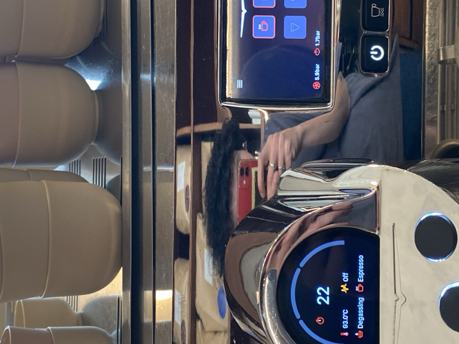 A highly reflective, professional-grade espresso machine is depicted, likely within a modern cafe setting in Tel Aviv-Yafo, Israel. The machine features polished chrome surfaces and two integrated digital displays. The left screen indicates a temperature of 93.0°C and displays "Degassing" and "Espresso" functions, alongside a numerical value of "22." The right screen shows pressure readings of 5.9 bar and 1.7 bar, along with touch-sensitive brewing and power controls. Above the machine, several light-colored, handleless ceramic or porcelain cups are stacked on a metal rack. A person with dark, curly hair, wearing a light-colored t-shirt and rings on their fingers, is visible in the machine's reflection. This individual is holding a red smartphone, positioned to capture the scene, with the phone's lens facing outward. The overall scene suggests a clean, operational coffee preparation area.
