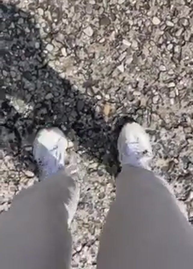 A person wearing white sneakers and light beige corduroy pants stands on a surface covered in small gray and white rocks. The camera, positioned above, shows the person's legs and feet as they shuffle slightly on the rocky ground. The sun is out, casting shadows across the gravel.