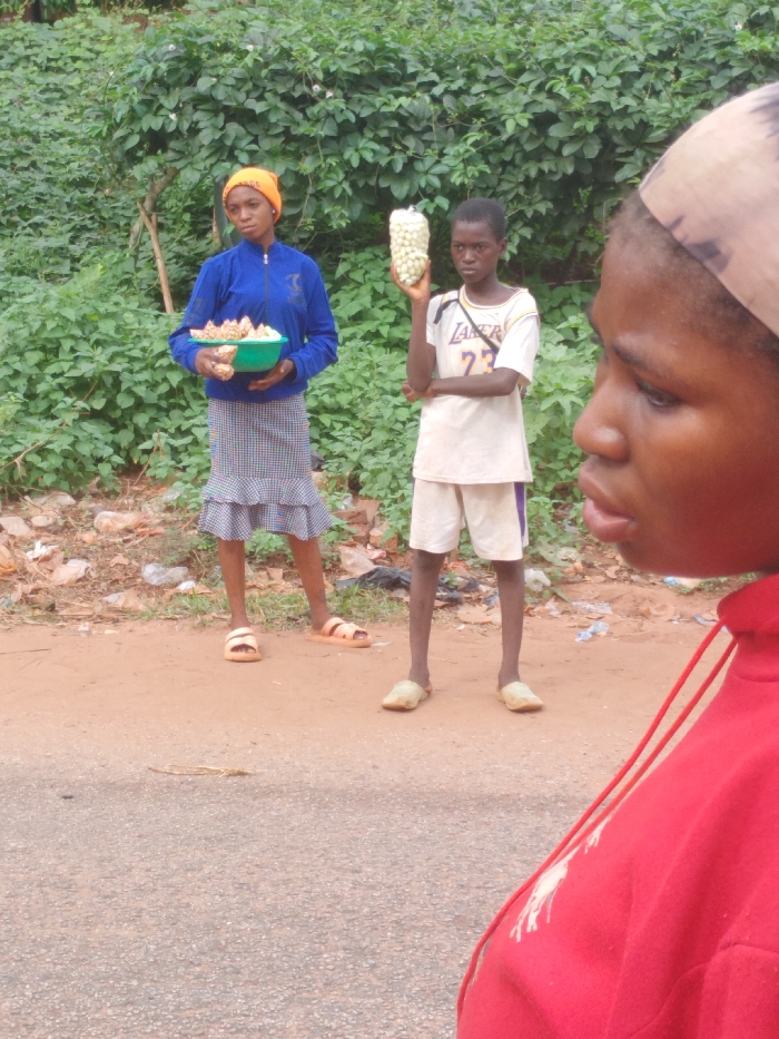 The scene depicts a street-side view in Ejule, Nigeria, featuring three individuals and their immediate environment. In the foreground, the right side of a person's head and upper torso are visible. This individual is wearing a red hooded garment with visible red drawstrings and a white logo on the right shoulder. A patterned head covering is visible on their head. Their gaze is directed towards the left, outside the frame. In the mid-ground, two individuals stand on a reddish-brown dirt shoulder adjacent to a grey asphalt road. To the left, a young female stands with a neutral expression. She wears an orange headwrap, a blue long-sleeved zippered jacket, and a black and white checkered skirt with a ruffled hem. On her feet are light orange open-toed sandals. She holds a light green bowl containing several small, light-colored, rounded items, possibly food. Her left arm is bent, holding the bowl towards her waist. To the right of her, a young male stands with a neutral expression. He wears a white t-shirt with "LAKERS 23" printed on the front, light-colored shorts, and light-colored open-toed sandals. In his right hand, held at chest height, he displays a large, elongated, white, textured object, consistent in appearance with a fruit or vegetable. His left hand is positioned on his side. The background consists of dense green foliage, appearing as bushes and small trees. The dirt ground between the individuals and the foliage contains scattered debris, including plastic bags and other discarded items. The asphalt road occupies the lower portion of the image.