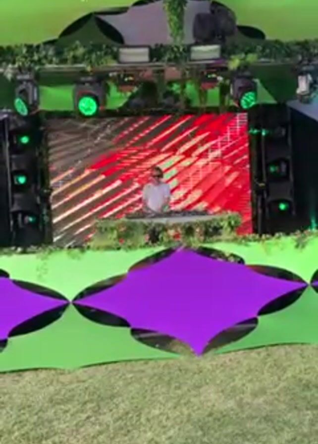DJ in a white shirt and glasses standing behind a mixing board on a stage with a large video screen behind him. The screen displays red and white visuals. The stage is decorated with green plants, and the structure above the stage is made of green and black fabric panels. Below the stage, there are additional panels of green and purple fabric. The stage is set up on a grassy field. There are speakers visible on either side of the DJ. The overall impression is that this is a music performance at an outdoor event or festival.