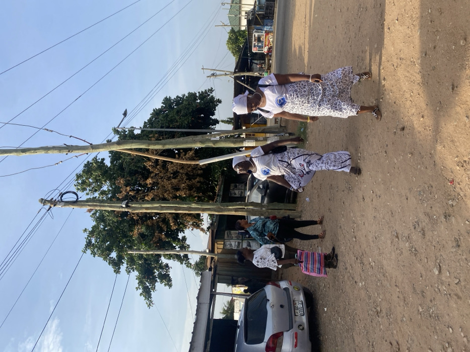 The image captures an unpaved street scene in Accra, Ghana, specifically identifiable as part of the Ga East District due to the "GD 8350-21" license plate visible on a silver Toyota Yaris hatchback parked on the left. Five adult females are present. In the immediate foreground, two women walk from left to right on the reddish-brown, dusty ground. Both wear white headscarves, white short-sleeved shirts with a blue circular logo, and patterned white and dark-colored skirts/wraps. The lead woman on the left is captured mid-stride, lifting her right leg. To the left of the frame, three other women stand near the parked vehicle; one wears a white ruffled top and black shorts, carrying a pink and white striped bag, while another wears a teal patterned top and black trousers. The background shows several low-rise structures with corrugated metal roofs, suggestive of roadside shops or stalls, alongside a large tree featuring both green and dried foliage. Multiple wooden utility poles laden with numerous overhead wires and a street light fixture are prominent throughout the scene under a clear blue sky.
