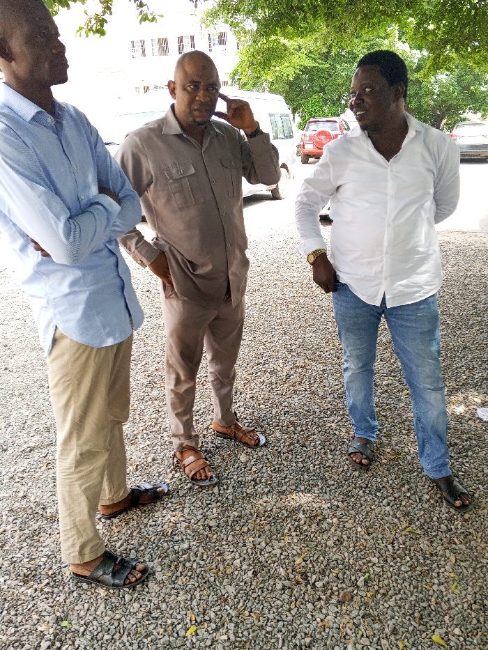 The image displays three adult males standing on a gravel surface in Lokoja, Nigeria