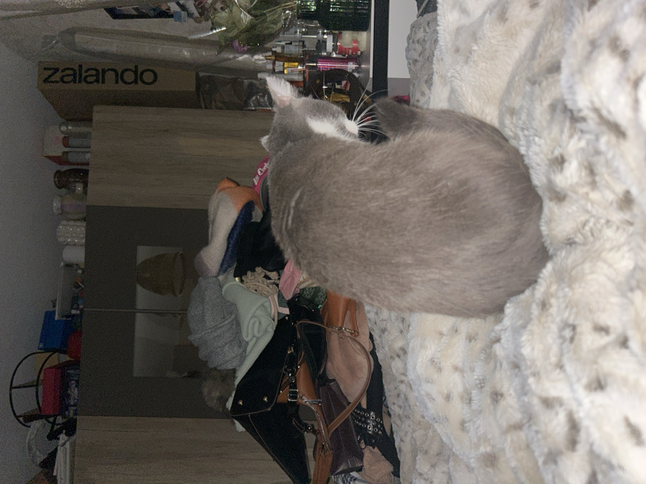 A gray cat with a white spot on its head curls up on a textured, light-colored blanket. Behind the cat, a collection of purses hangs in front of a dark surface. A box with the word "zalando" printed on it sits on top of a shelf or cabinet. To the left, there's a shelf filled with items. The lighting is dim, and the image appears to be rotated.