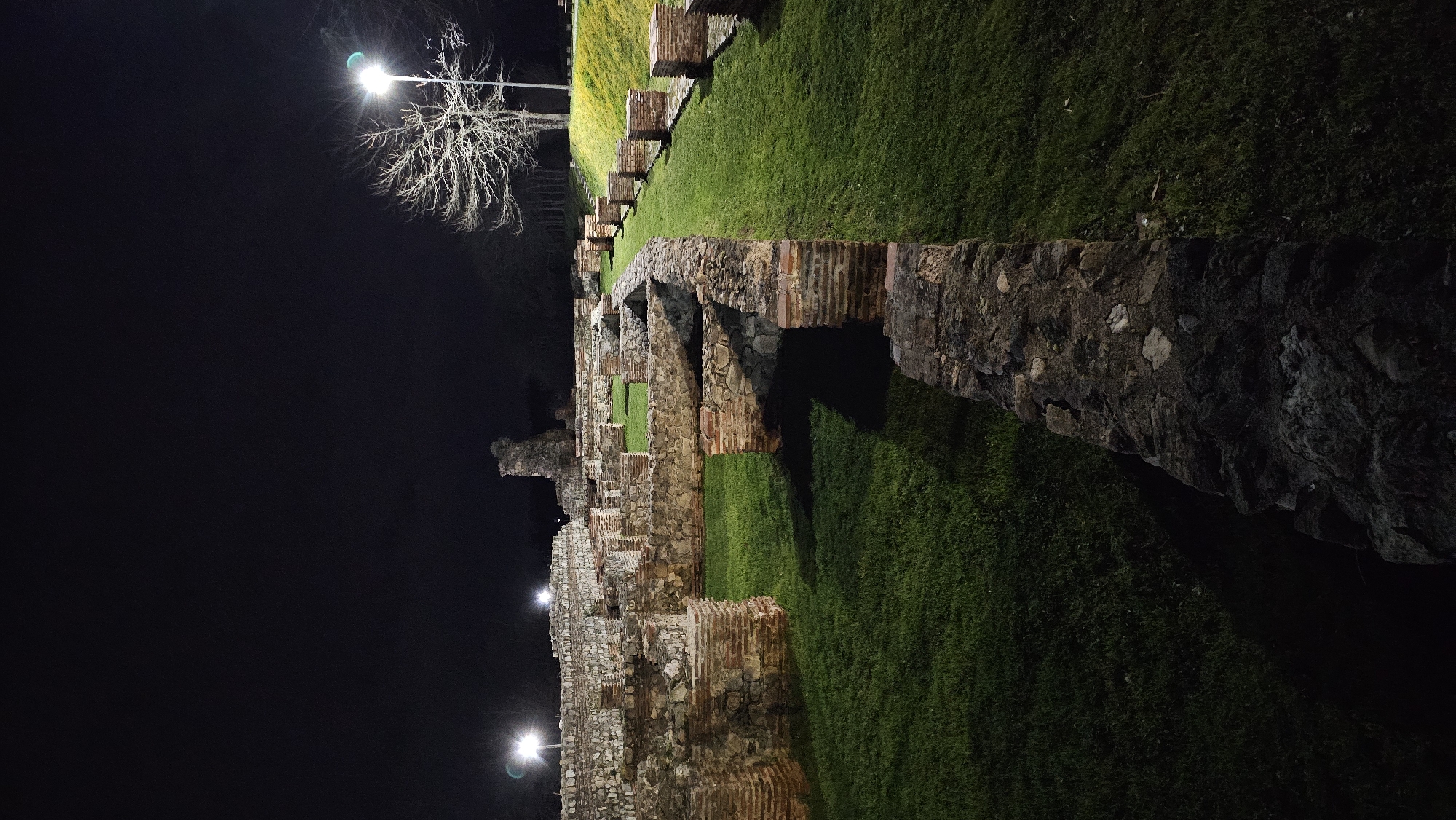 ruins of the Roman Thermae (public baths) in Hisarya, Bulgaria, at night. The ruins consist of stone and brick walls with grassy areas in between. The walls are partially illuminated by streetlights. In the background is a dark sky with a street lamp and a bare tree. The ruins appear to be well-maintained, with green grass growing within the structure.