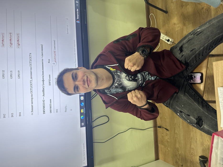 An indoor scene in Pravets, Bulgaria, shows a young adult male seated, facing forward with a smile, and both fists clenched at chest level. He has short dark hair, wears a maroon zip-up hoodie over a black t-shirt featuring a white graphic of Jesus, and dark grey ripped jeans with white paint splatters. A black beaded bracelet adorns his left wrist, and a black digital watch is on his right wrist. A black smartphone displaying "21:11" rests screen-up on a wooden stool between his spread legs. Behind the male, a large, light-colored flat-panel display shows technical documentation or code. Visible English text includes "IN2", "GPIO 32", "leftMotor1", "DRV8833 #2 - Auxiliary", and "ESP32 pin". Bulgarian text is also present, reading "Левият мотор на OUT1/OUT2, десният на OUT3/OUT4" (The left motor on OUT1/OUT2, the right on OUT3/OUT4), and "(кофата/накланянето + светлини)" (bucket/tilt + lights). A Windows taskbar with icons is visible at the bottom of the display. The background consists of a light green wall and a wooden floor. A black electrical cord runs along the base of the wall, and a white power strip with multiple outlets is visible on the floor to the right of the subject. A white container with pink trim is partially visible in the lower left foreground.
