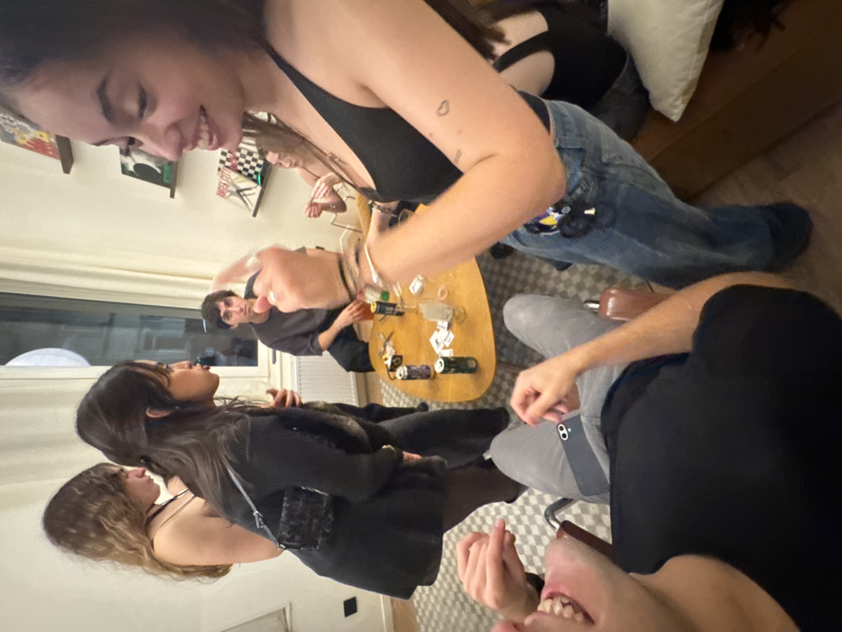Several young adults are gathered around a small, light-colored wooden table laden with drinks and cards. One person in a black top and jeans points towards the table, smiling. Another person wears a black top and jeans. A man with dark hair and a grey sweatshirt sits across the table. Another person with dark hair is wearing a black jacket, and a small black purse with a chain strap. Someone in grey sweatpants is at the table's edge.