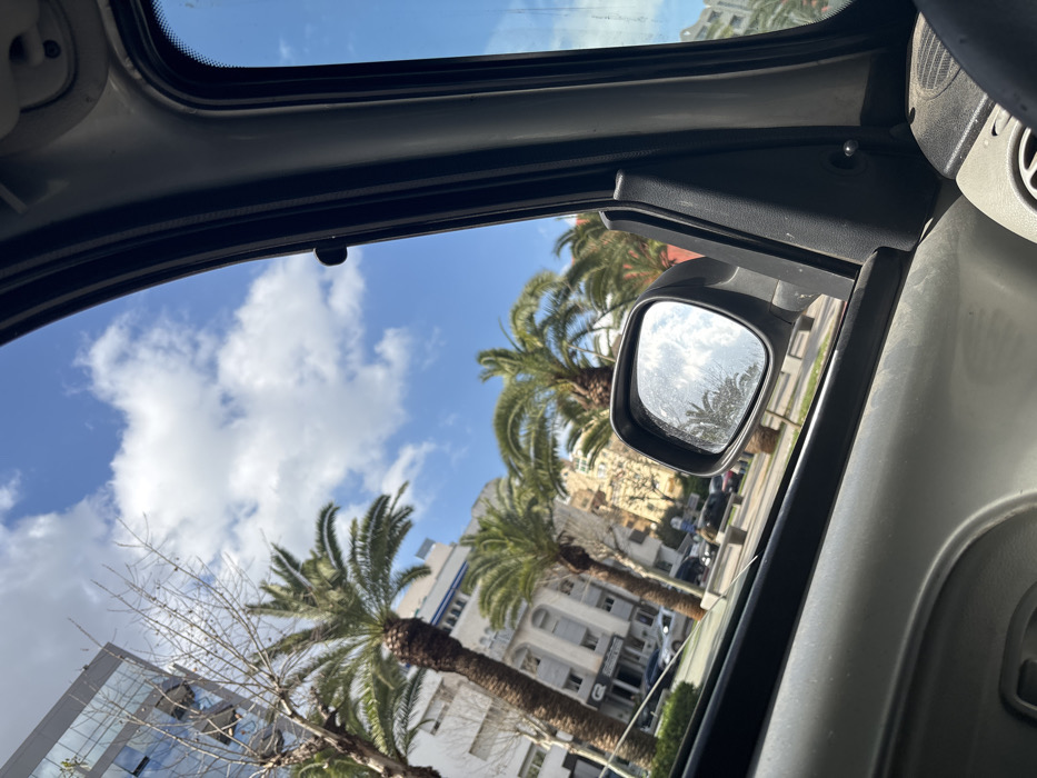 The image presents an urban street scene in Fez, Morocco, captured from the passenger side interior of a vehicle during daylight hours. The immediate foreground reveals portions of the vehicle's light-colored door panel and a dark gray A-pillar, partially obscuring the view. A dark gray exterior side mirror is visible on the right, its glass surface exhibiting some dust or grime, reflecting a distorted view of the sky, clouds, and palm trees behind the vehicle. Beyond the vehicle, a wide street or boulevard is lined with numerous tall palm trees and several bare deciduous trees, indicating a specific season. In the background, multiple multi-story buildings are visible, constructed with light-colored facades. One building on the left features a modern glass facade, reflecting the sky. Another building further down the street displays a dark "GR" logo on its exterior. Several parked vehicles are discernible along the street. The sky overhead is a clear bright blue, accented by scattered white cumulus clouds. No individuals are explicitly visible, and no specific actions or interactions are depicted.