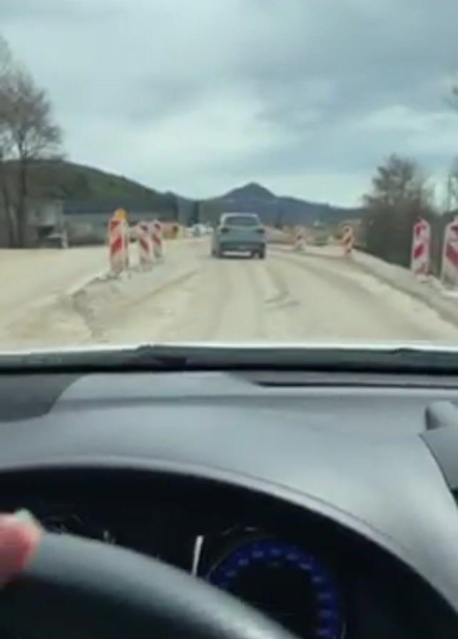 From the perspective of the driver inside a white vehicle, a bumpy, dirt road is shown with red and white striped poles lining both sides of the road. In the distance is a gray SUV driving ahead, and a mountain is visible in the background under a cloudy sky. The driver's hand is briefly visible on the steering wheel. The dashboard of the vehicle is visible, displaying the speedometer and other gauges. The overall scene suggests a road construction or repair area.