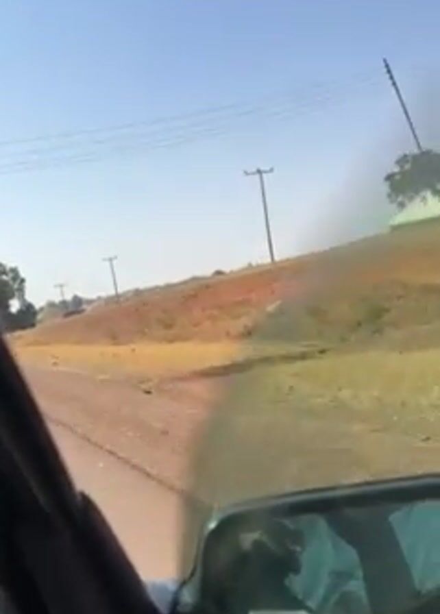 view from inside a moving car, likely the driver's perspective, looking out the front windshield. The car is traveling on a paved road through a rural area. The landscape is predominantly dry, with reddish-brown soil and sparse, yellowed vegetation. Wooden utility poles run alongside the road, with wires strung between them. The sky is clear and blue. At one point, a person riding a yellow bicycle is visible to the right of the road, passing the car.
