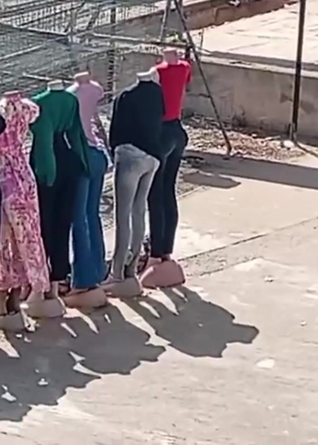 The camera is stationary, capturing a street scene. A row of seven headless mannequins stands on a concrete surface. They are arranged side-by-side and are clothed in a variety of outfits: a long purple dress, a short black dress, a floral print dress, a green top and black pants, a pink top and blue jeans, a black top and gray jeans, and a red top and black pants. The mannequins are casting distinct shadows on the concrete. Behind the mannequins, a metal rack lies on its side, and in the background, a small truck-like vehicle with a metal grate is visible. There's also a partially visible person in the distance, standing near a sign. The overall lighting is bright, suggesting a sunny day.